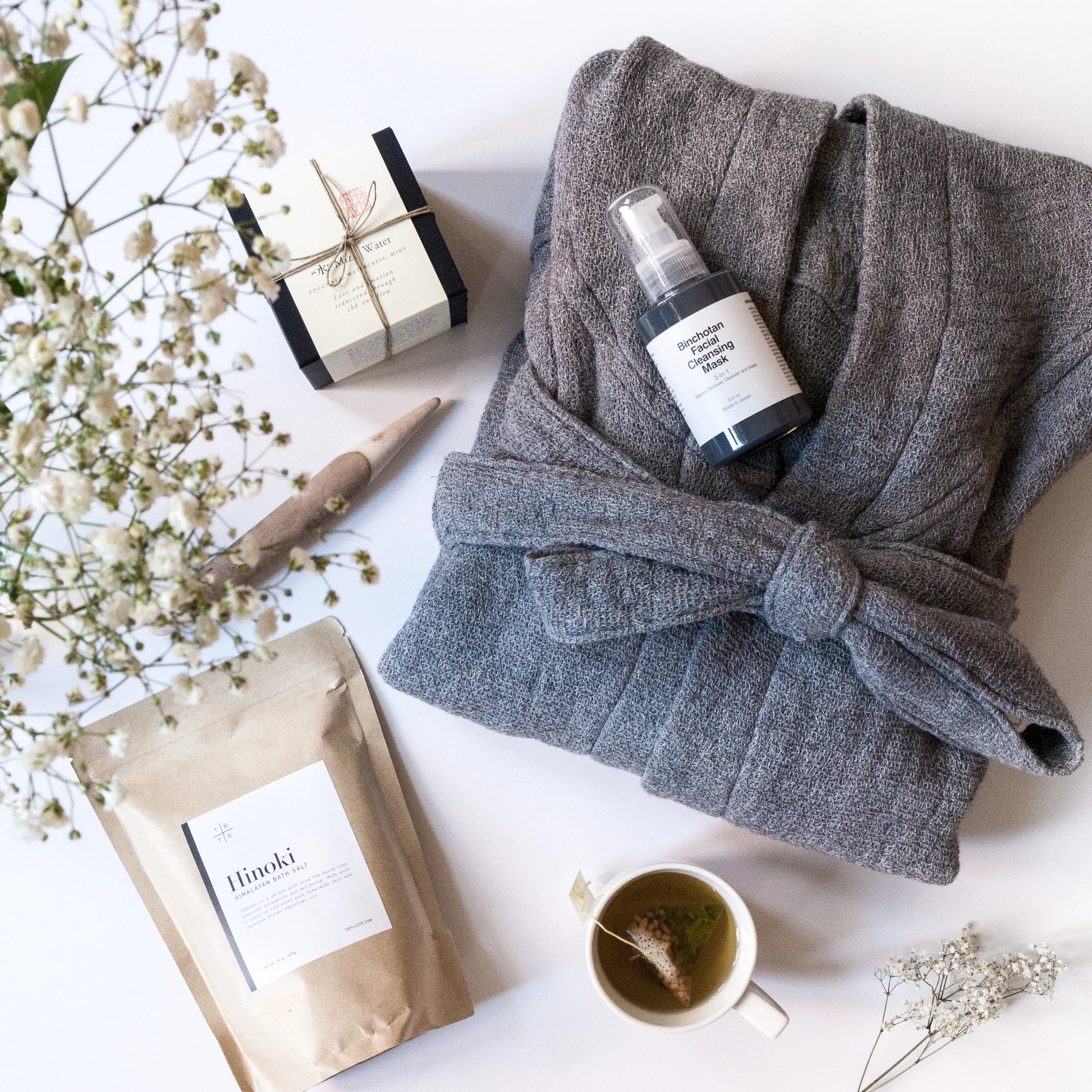 Pictured clockwise from right: Binchotan Facial Cleansing Mask, Lana Bathrobe in Grey, Morihata Organic Genmaicha Tea Bags, Hinoki Himalayan Bath Salts, Shiatsu stick, 5 Elements Candle in Water.
