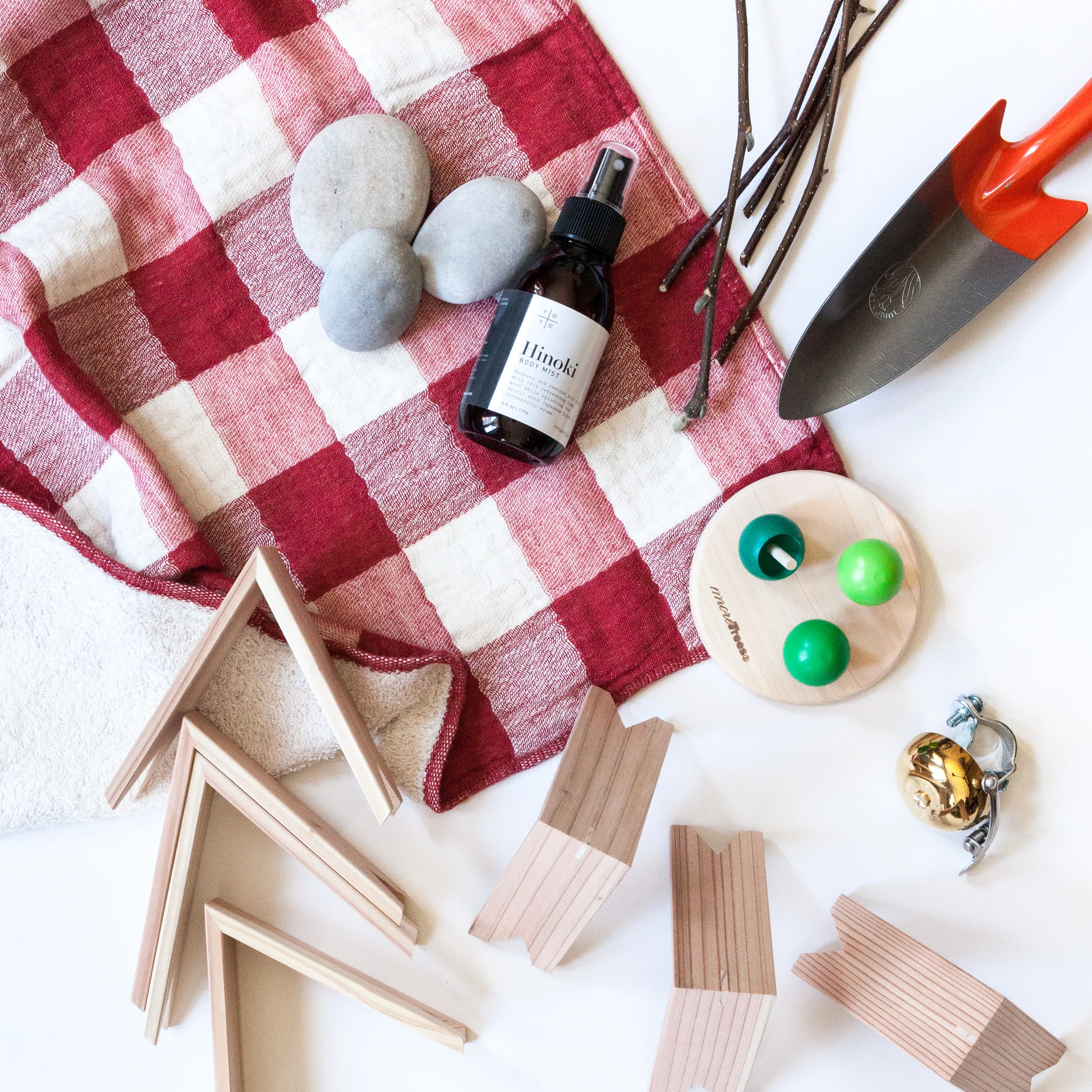 Pictured clockwise from right: Tulip Trowel, Wooden Tree Tops, Bicycle Bell, Wooden Building Blocks (store exclusive), Vintage Check Towel, Hinoki Body Mist.